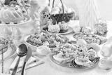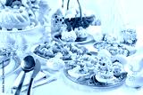 Easter breakfast with fresh salad stuffed eggs and traditional pastries