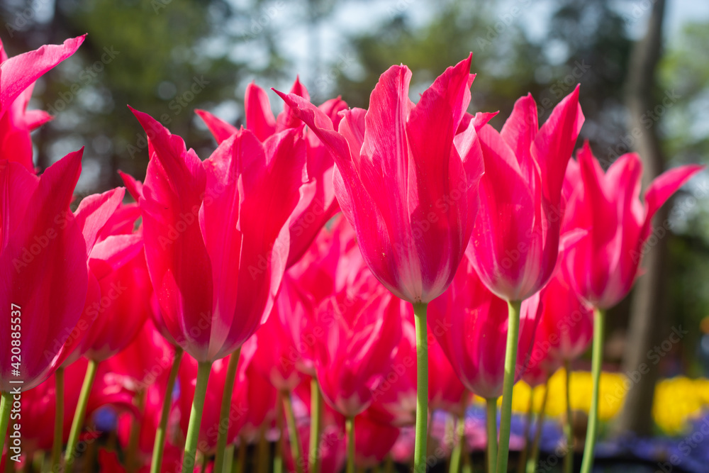 Blooming tulip flowers in spring as floral background