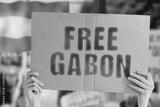 The phrase " Free Gabon " on a banner in men's hand with blurred Gabonese flag on the background. Protest. Riot. Violence. Economic crisis. Collapse. Politics. Streets. Save. Cruelty