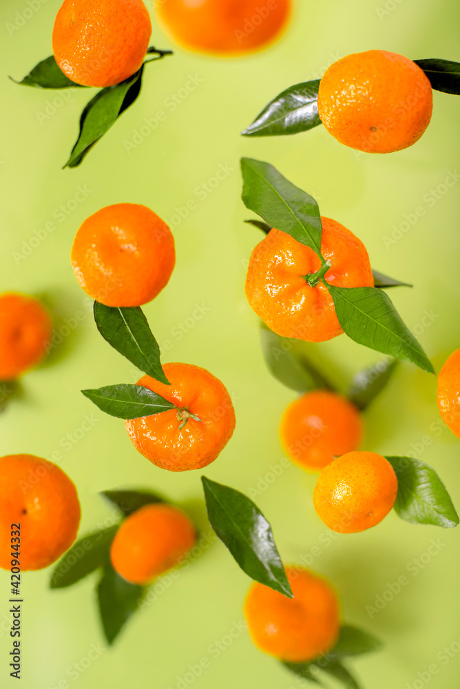 Fresh, ripe, juicy tangerines with leaves, falling or flying in the sunlight.
