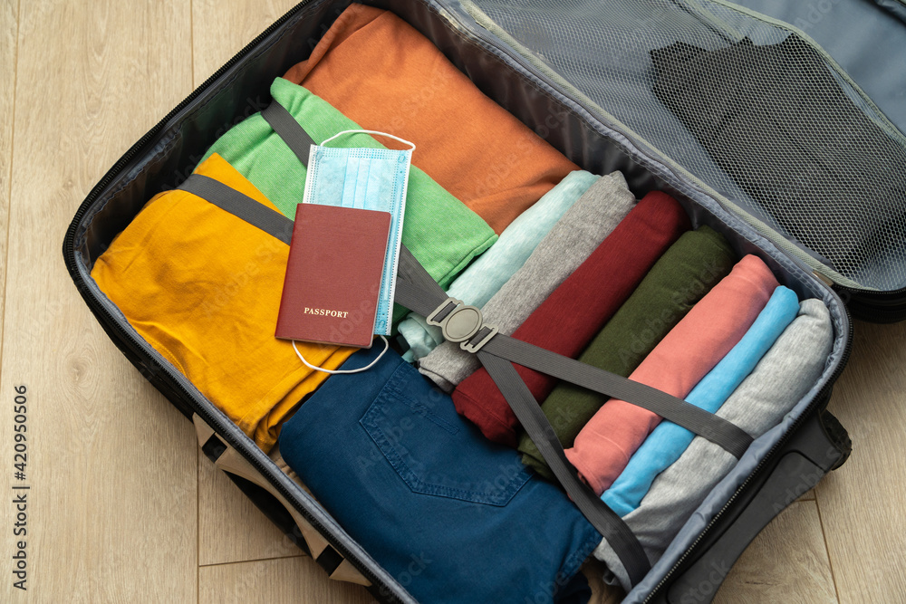 Top view of an open suitcase with neatly folded clothes and a passport with a medical mask. New reality of movement around the world.