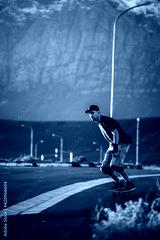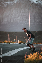 Skateboarder skateboarding on an open road doing freestyle tricks