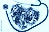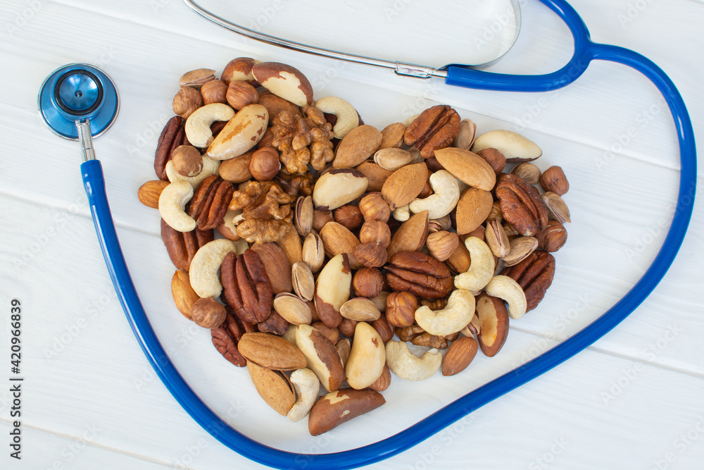 Organic nuts in the shape of a heart and a stethoscope. Healthy food for the heart, useful microelements and vitamins. Healthy Concept. Healthy food for the heart, useful microelements and vitamins.