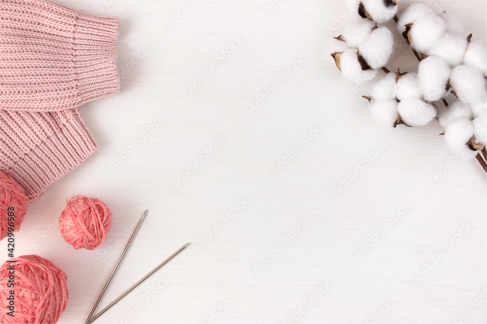 Skeins of pink yarn, metallic knitting needles, a knitted sweater and a branch of cotton on a light background. Female needlework concept. Flat lay.