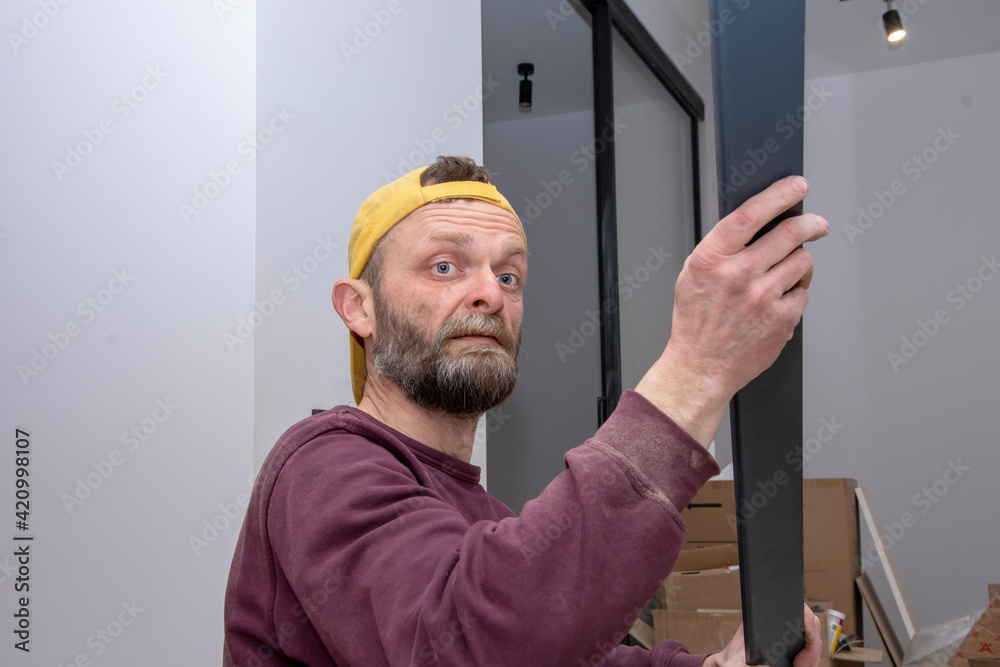 A 45-50-year-old male construction worker in a yellow cap holds a door trim or skirting board in his hands. Concept: illegal work abroad, interior decoration, ad work.