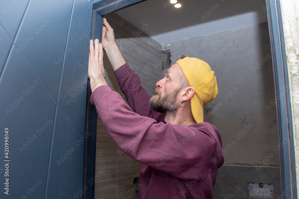 An elderly male construction worker installs doors in the doorway of an apartment. Interior decoration, construction work, apartment repairs.