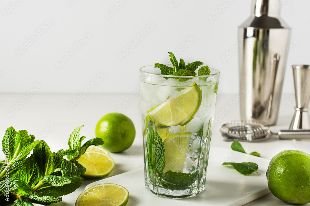 A glass of refreshing summer mojito cocktail with ice cubes, fresh mint and lime on white.