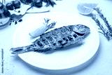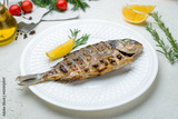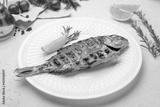Dorado on grill on a white plate on white concrete table
