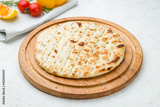 Greek pita on the board on white concrete table