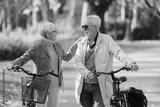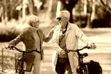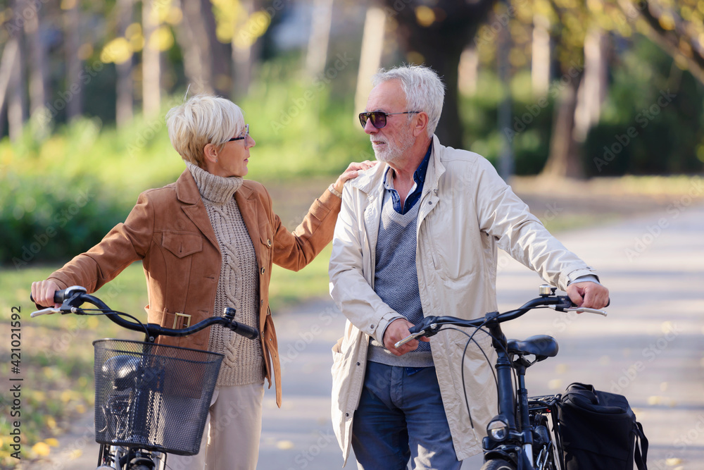 Cheerful active senior couple with bicycles walking through park together. Perfect activities for elderly people