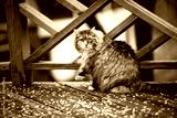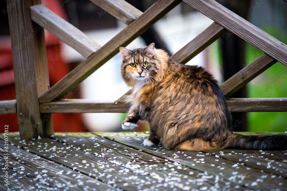 One calico maine coon cat sitting outside outdoors by wooden deck fence and green spring bokeh blurry background shocked expression, grooming with paw raised
