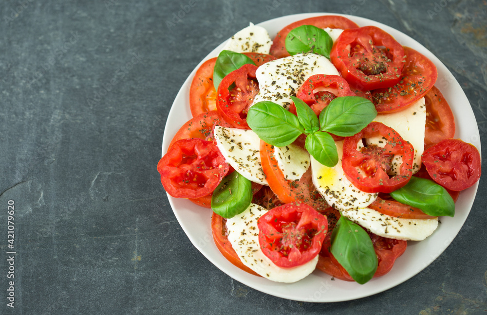 Fresh caprese salad with mozzarella, tomato, basil and spices on the plate