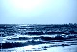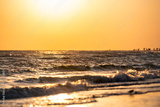 Sunset sun in Siesta Key, Florida at Sarasota, USA with coast ocean gulf of mexico and silhouette of distant people in far distance walking on beach