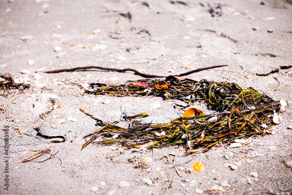 Macro closeup of many broken seashells sea shells shelling on Sanibel Island, Florida at Gulf of Mexico sand shore with seaweed on beach