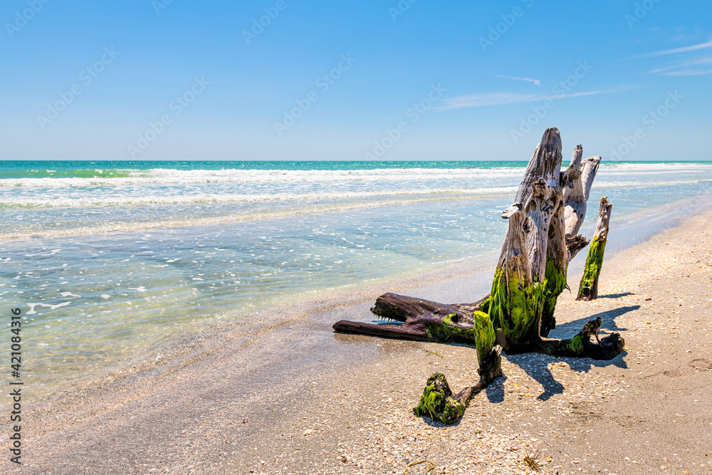 Sanibel Island, Florida, USA Bowman's beach with damaged hurricane dead tree trunk in green seaweed by colorful turquoise water on sunny day by ocean Gulf of Mexico water