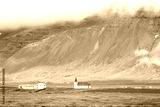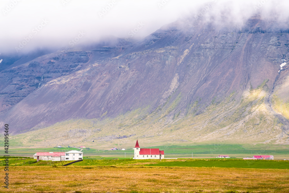 Landscape view of mountain on cloudy day and red roof church in Hellnar city village in summer with red architecture color