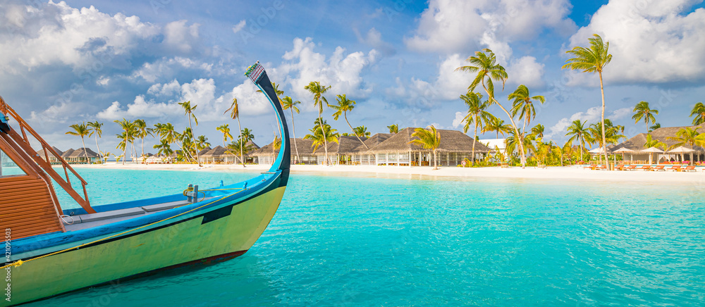 Inspirational Maldives beach design. Maldives traditional boat Dhoni and perfect blue sea with lagoon. Luxury tropical resort hotel paradise view. Idyllic coast, shore with white sand, palm trees