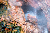 Closeup of steam geyser long exposure steam in Deildartunguhver hot springs in Iceland with red rock colorful cave opening hole and water boiling