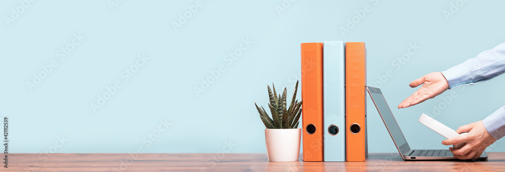 Slim laptop. Hands of female business woman pointing at screen holding headphones. Blue and orange document binders files on an neat office desk. Cactus in a pot. Small Business banner. Copy space