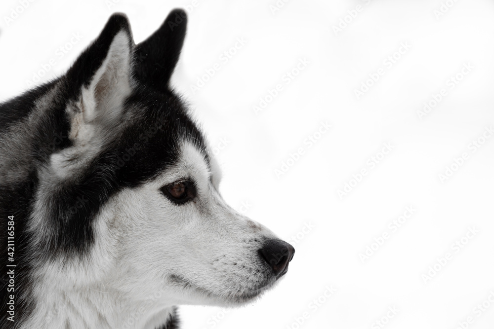 Portrait of a dog of the Siberian Husky breed. Black-white dog with brown eyes on a white background. Copy space. The animal on the left of the frame looks to the right. High quality photo