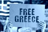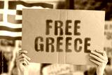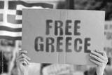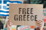 The phrase " Free Greece " on a banner in men's hand with blurred Greek flag on the background. Protest. Riot. Violence. Economic crisis. Collapse. Politics. Streets. Save. Cruelty