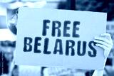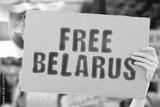 The phrase " Free Belarus " on a banner in men's hand with blurred Belarusian flag on the background. Protest. Riot. Violence. Economic crisis. Collapse. Politics. Streets. Save. Cruelty
