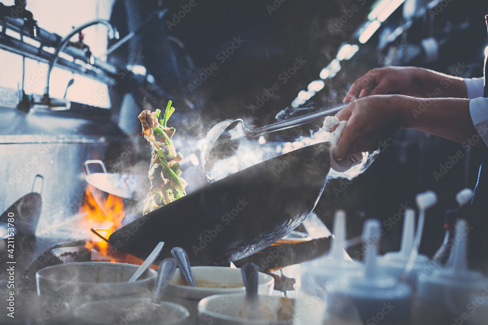 Chef stir fry busy cooking in kitchen. Chef stir fry the food in a frying pan, smoke and splatter the sauce in the kitchen.