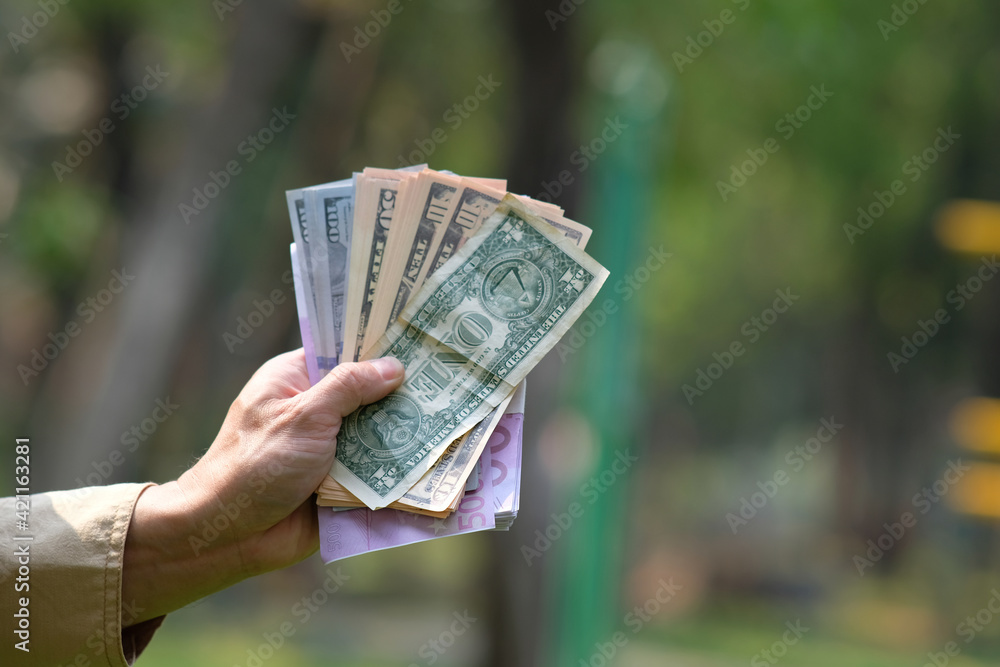 Hand holding banknote money and saving money and business growth concept, Finance and investment concept