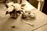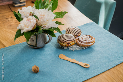on blue linen napkin on a wooden table there is a bouquet of delicate pink peonies and sweet buns lie