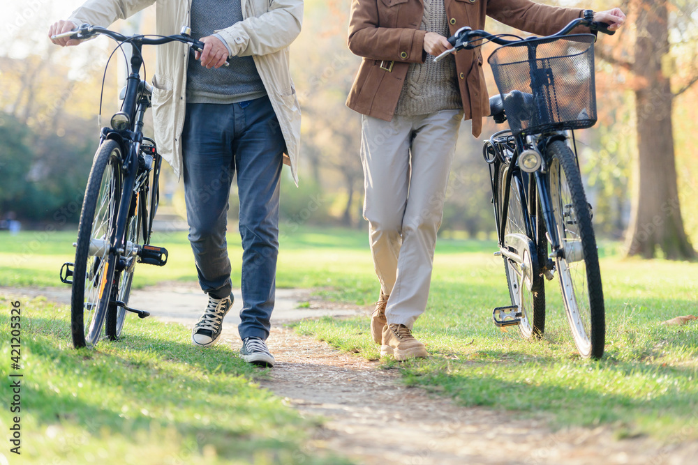 Cheerful active senior couple with bicycles walking through park together. Perfect activities for elderly people