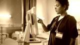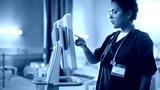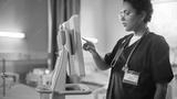 Hospital Ward: Beautiful Black Female Head Nurse, Doctor, Surgeon Uses Health Care Vitals Monitoring Computer Machine. Modern High Tech Clinic with Advanced Equipment and Professional Staff