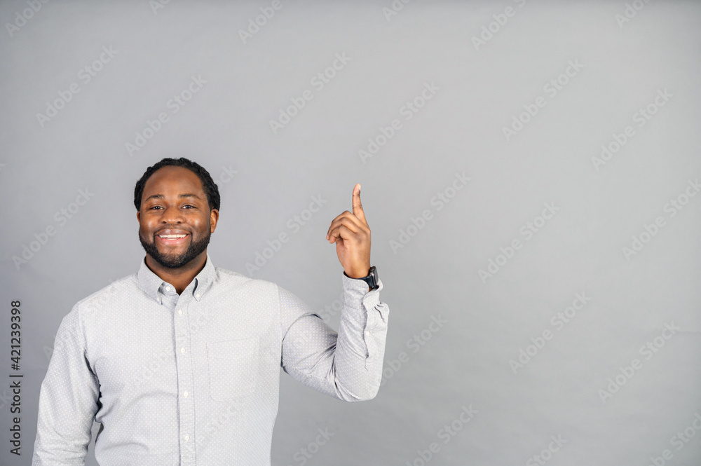 Cheerful African-American guy points finger up, came up with a new solution, has a new idea, copy space for advertisement text, a black man in smart casual shirt isolated on grey