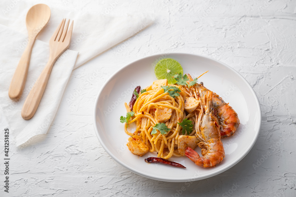Spaghetti Tom Yum Kung,Thai style fusion food, spicy pasta with Giant freshwater prawns in tom yum sauce.