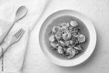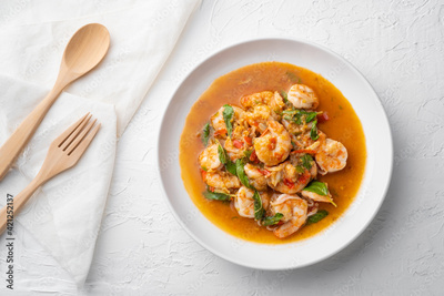 Stir fried shrimp with basil on white plate,thai spicy food.Top view