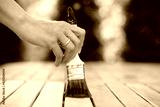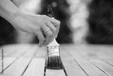 hand holding a brush applying varnish paint on a wooden garden table - painting and caring for wood with oil