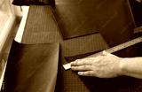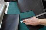 Men s hand holding a stationery knife and metal ruler and cutting on a pieces for a leather wallet in his workshop. Working process with a brown natural leather. Craftsman holding a crafting tools.