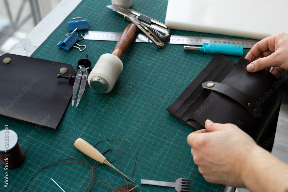Mens hand working on the leather wallet in his workshop. Working process with a brown natural leather. Craftsman holding a crafting tools.