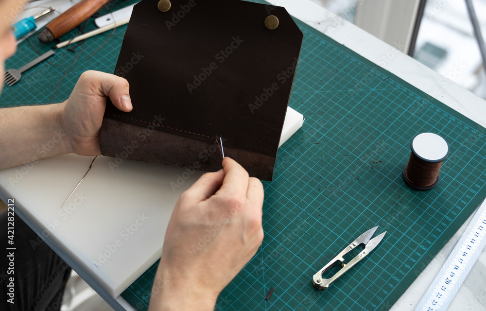 Mens hand working on the leather wallet in his workshop. Working process with a brown natural leather. Craftsman holding a crafting tools.