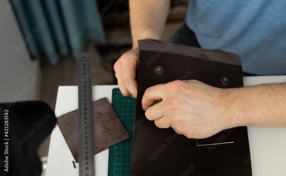 Mens hand working on the leather wallet in his workshop. Working process with a brown natural leather. Craftsman holding a crafting tools.