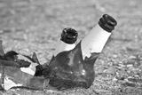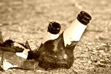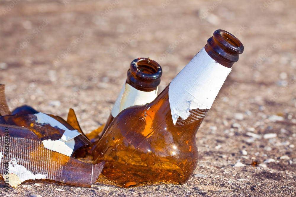 Shattered beer bottle resting on the ground - alcoholism concept