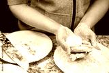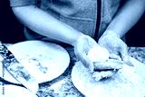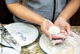 Woman dirty hands holding and forming homemade mochi sticky glutinous Japanese rice cake dessert at home kitchen