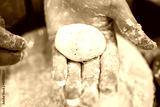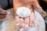 Side macro closeup view of woman dirty hands holding homemade round mochi sticky glutinous Japanese rice cake dessert at home kitchen by plate