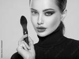Portrait of a girl with cosmetic brush near face. Woman making makeup on the face using makeup brush. One half face of a beautiful white woman with bright makeup and the other is natural.