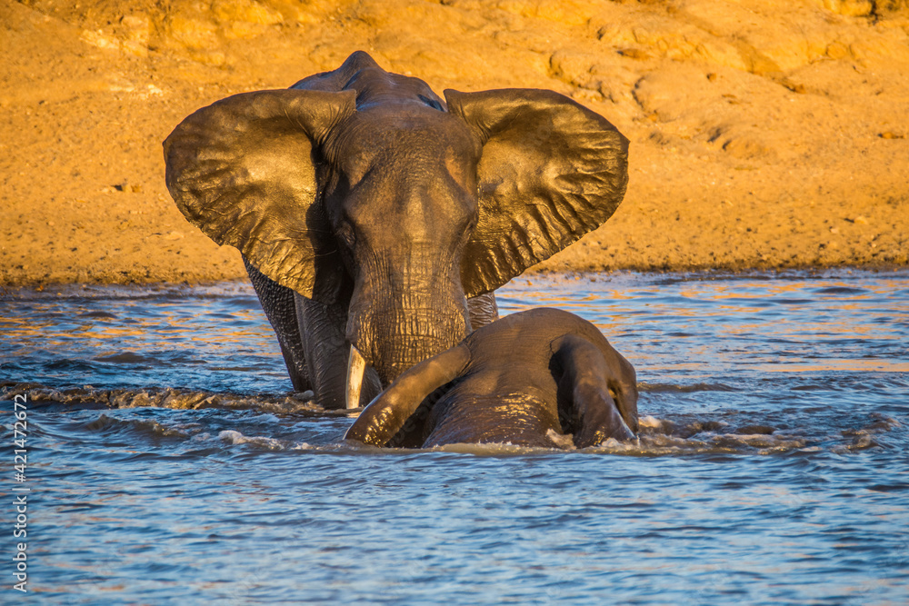 African Elephant Bulls, Loxodonta africana, in water in South Africa's Kruger National Park