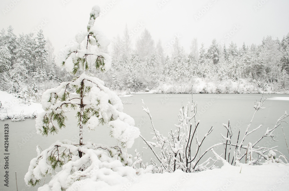 Snowy trees and frozen pond in winter