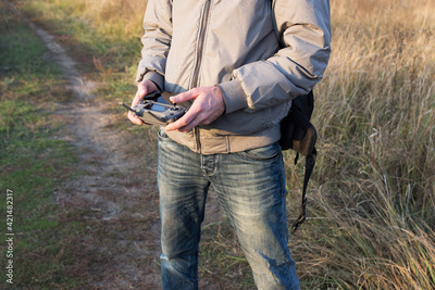 A man holds a drone control panel in his hands close-up.