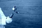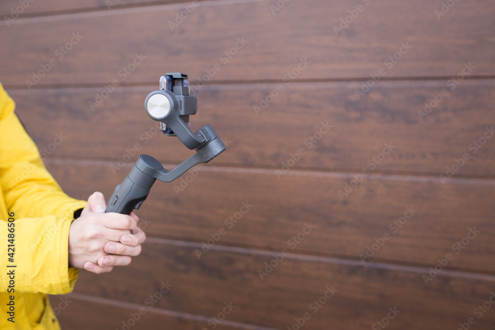 A man holds a stabilizer for smartphones. Mobile shooting on the street.