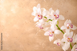 Beautiful white orchid flower on beige background. Close-up, copy space.