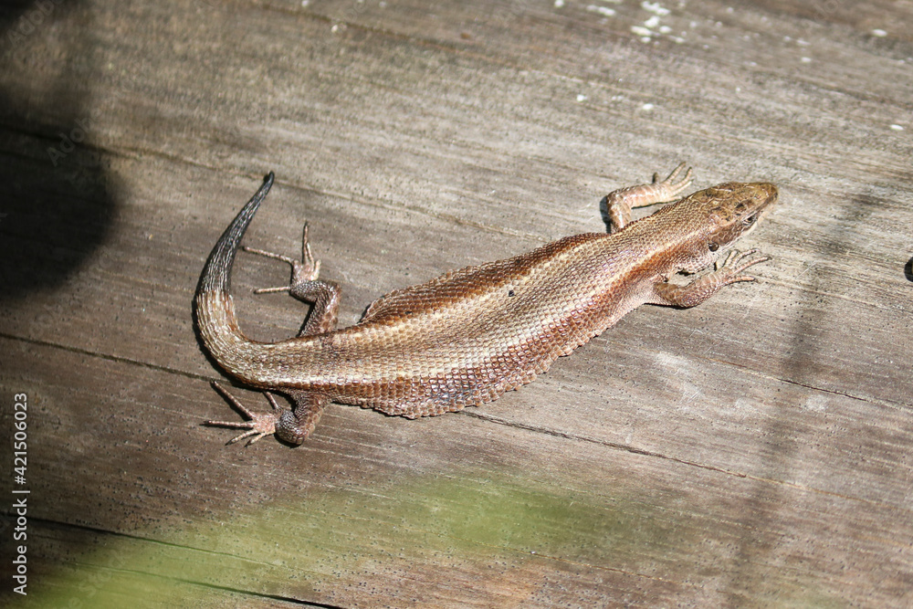 The viviparous lizard, or common lizard, (Zootoca vivipara) sits on an old dry log and bask in the sun.