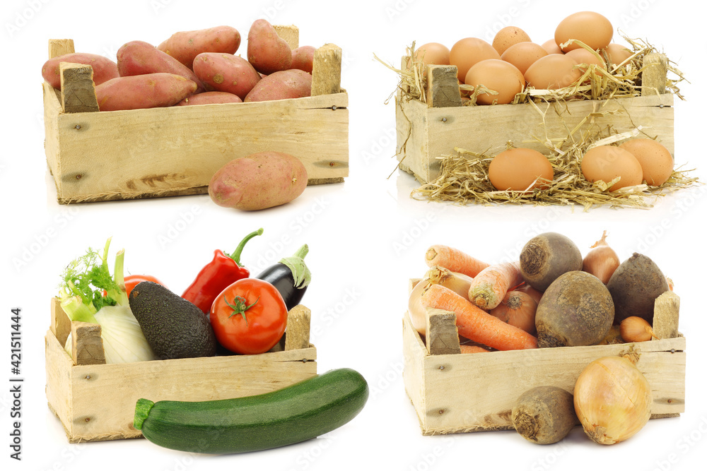 Freshly harvested cooking ingredients in wooden crate on a white background